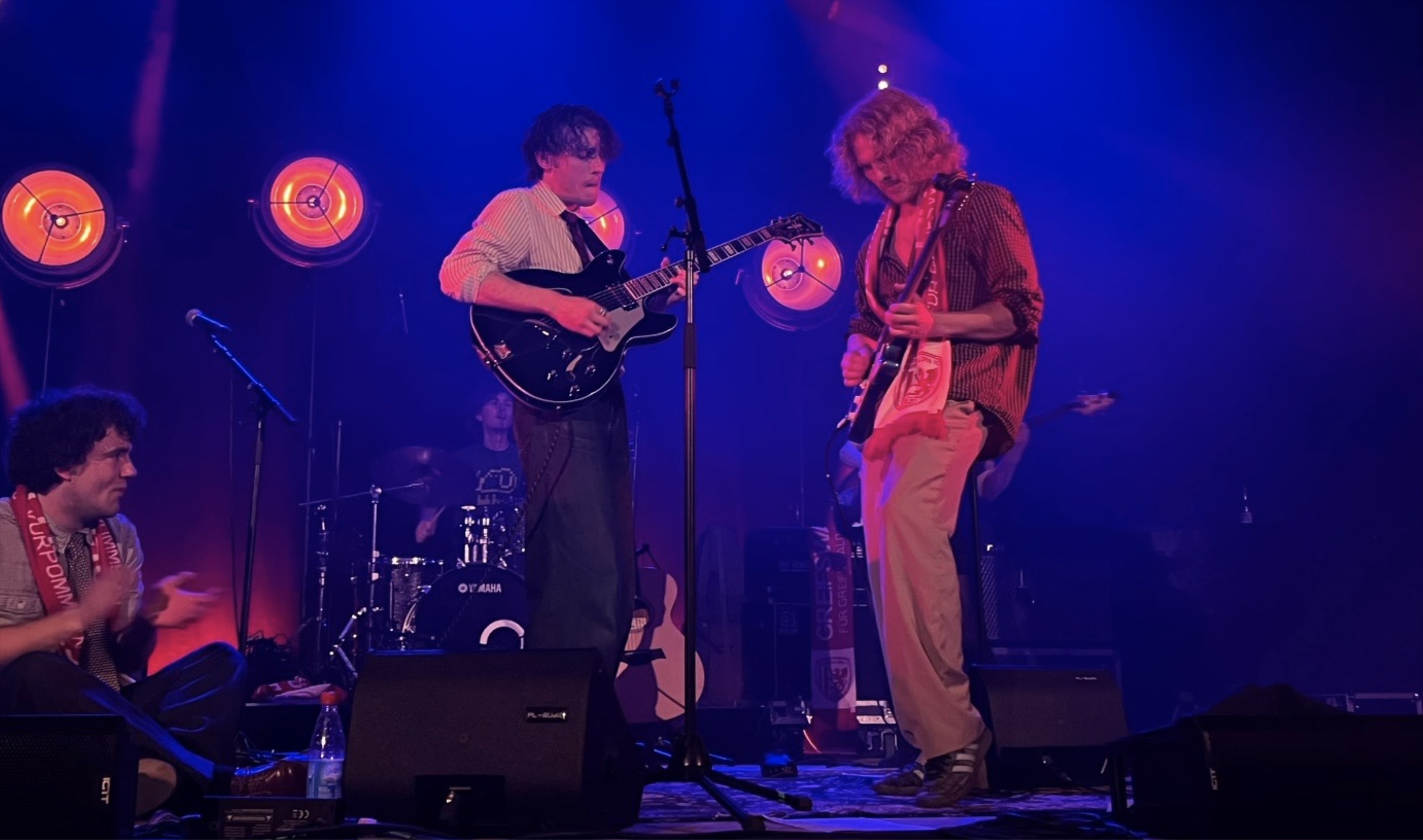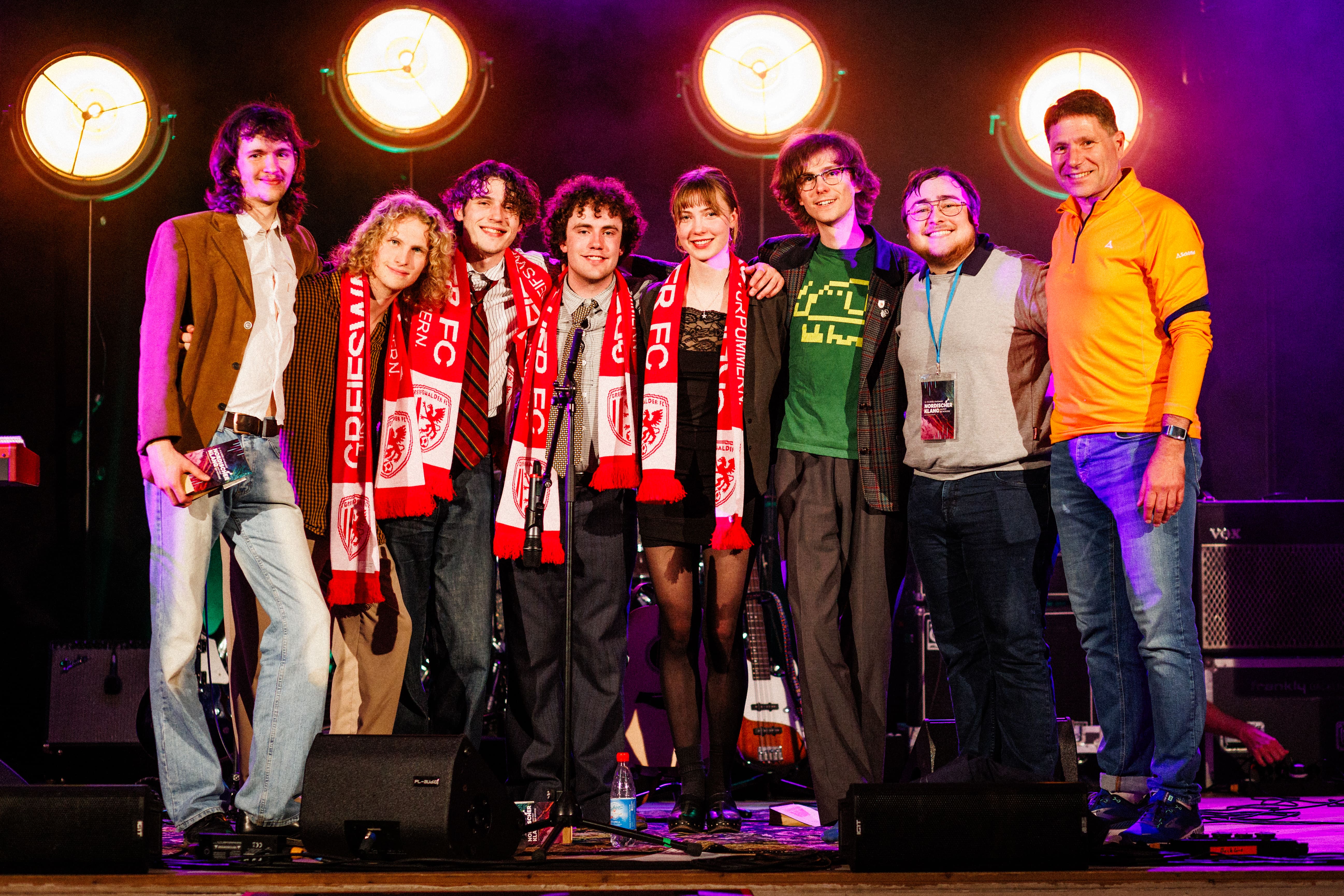 Dann war es endlich so weit: Die Band kam auf die Bühne und schuf mit einem atmosphärischen Intro einen leuchtenden Strom aus Klangfarben, der sich parallel in der farbenfrohen Bühnenbeleuchtung widerspiegelte. Außerdem fielen sofort die einheitlichen Accessoires der Bandmitglieder auf – rote Schals des Greifswalder FC. Obwohl die Schweden erst einen knappen Tag in der Stadt (und zum ersten Mal in Deutschland) waren, sprachen sie direkt in ihren ersten Worten zum Publikum über ihre unvergessliche Erfahrung in Greifswald und lobten dabei die vorher verzehrten regionalen Bratwürste. Schon nach dieser kurzen Moderation hatten sich die Musiker so viel Sympathie-Punkte gesammelt, dass sich zwischen ihnen und dem Publikum schon fast eine freundschaftliche Verbindung einstellte.