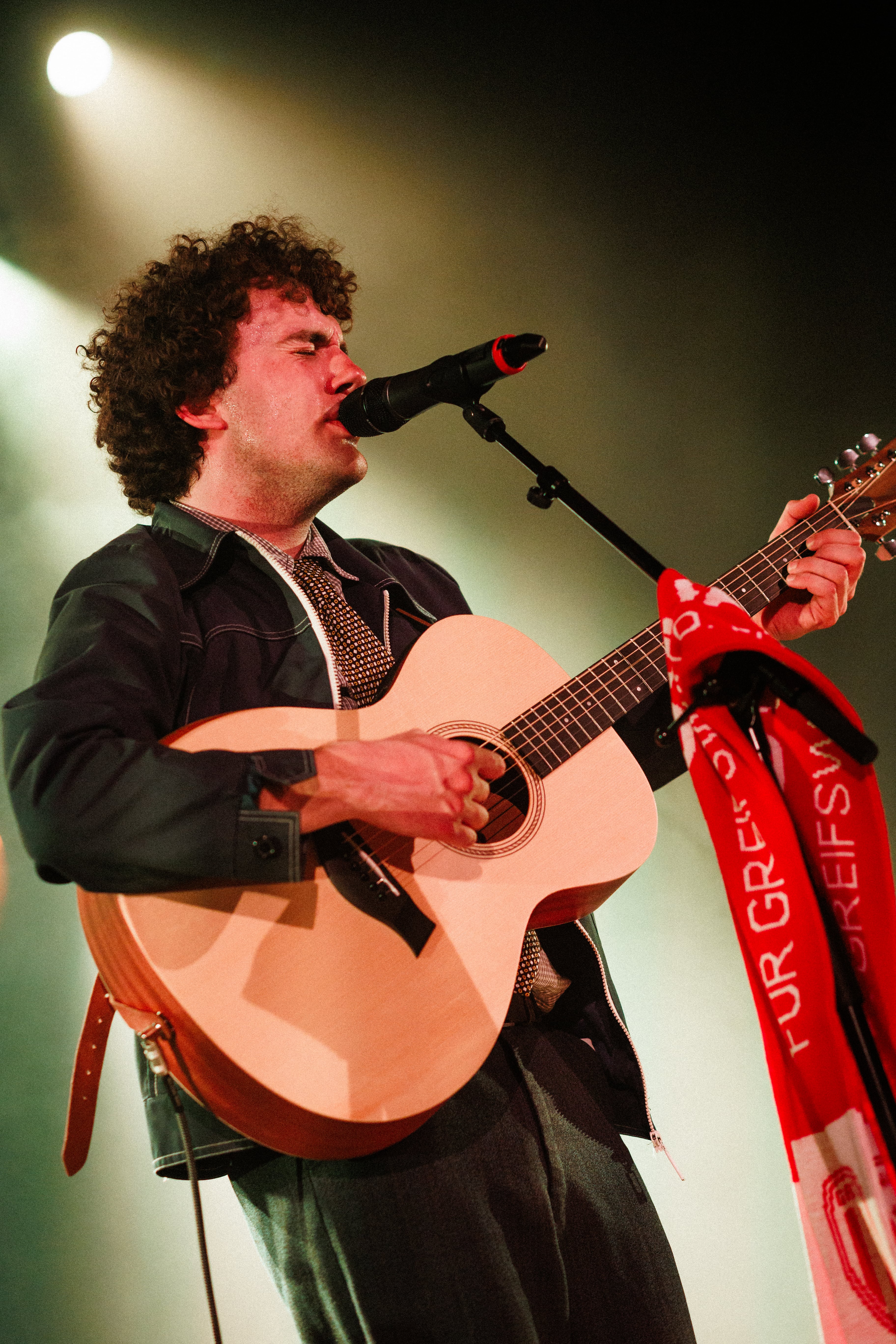 Am Samstag, dem 10. Mai 2025, fand in der Straze das Abschlussfest des Festivals Nordischer Klang statt. Schon beim Betreten des Gebäudes lag eine gespannte Erwartung in der Luft, die sich mit der schnell ansteigenden Publikumsmenge immer weiter intensivierte. Denn, wie sich im Verlauf des Abends herausstellte, sind Singer/Songwriter Johan Norborg und seine sechsköpfige Live-Band nicht unbekannt für die Gäste gewesen. Nachdem sich der Raum mit Parkett und Balustrade gefüllt hatte, eröffnete Festivalleiter Clemens Räthel das Programm mit einer Dankesrede an die Helfer und Organisatoren des Festivals, die seit Januar desselben Jahres leidenschaftlich die Veranstaltungen vorbereitet haben. Seine humorvollen Worte sorgten für eine freudige Atmosphäre, ohne dabei die aufrichtige Wertschätzung des Teams zu kurz kommen zu lassen. Als dann das Mikrofon an den Künstlerischen Leiter Frithjof Strauß übergeben wurde, stieg merklich die Vorfreude auf den kommenden Act, denn seine einführenden Worte über die Band bzw. dessen Einzigartigkeit in Bezug auf Lieder über Städte und besonders seine kurzen Gesangs-Einlagen, ließen den ganzen Raum förmlich glühen.
