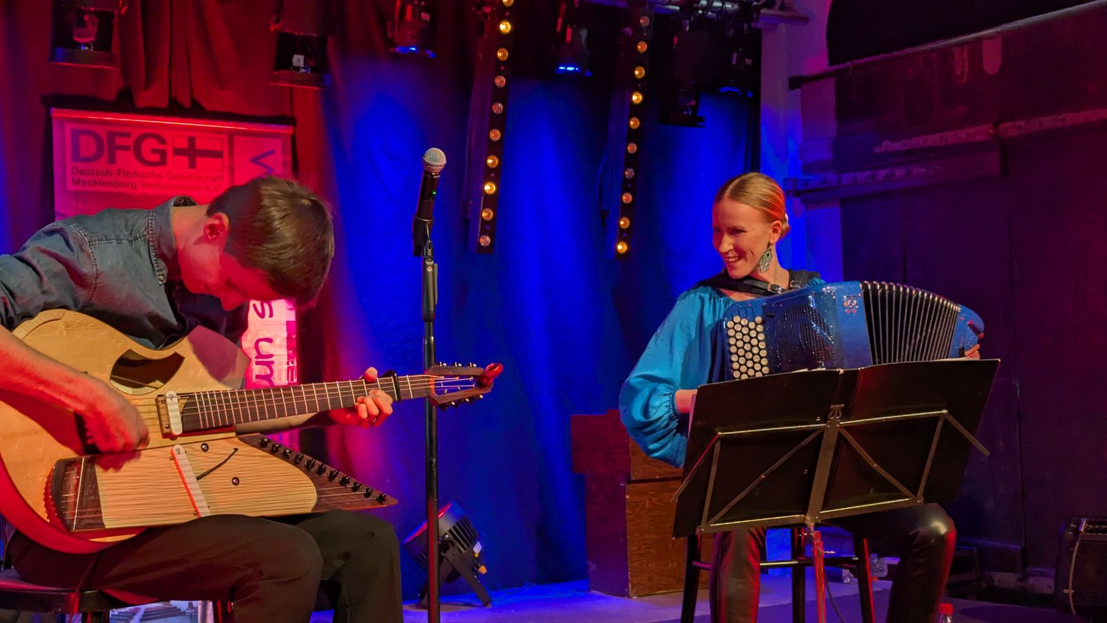 Dann treten sie auf: Viivi Maria Saarenkylä mit ihrem Akkordeon, und J-P Piirainen an der Gitarre. Beide wirken wie aus einem nordischen Kunstfilm entsprungen – groß, schmal, beinahe zerbrechlich, introvertiert, fast durchscheinend. Sie sagen nicht viel. Ihre Sprache ist die Musik.
